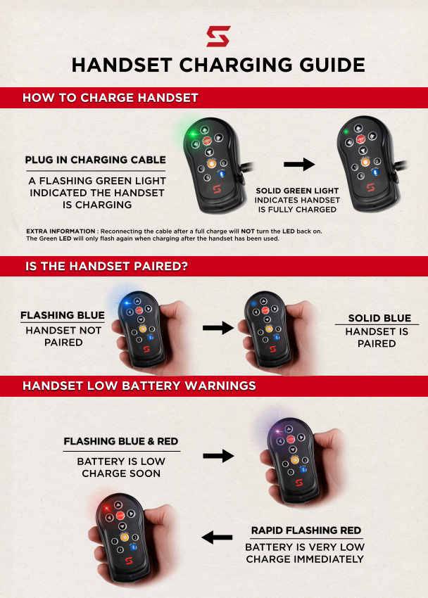 - Flashing blue LED when the handset is turned on and not paired to a trolley.